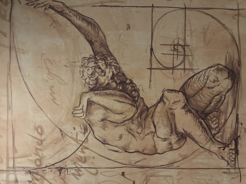 A sepia-toned sketch depicts a reclining male figure. The man's left arm is raised. He has curly hair. The background features a spiral, seemingly the golden ratio, and faded, illegible text. The figure is rendered in a classical style with attention to musculature. The composition uses the golden ratio for placement. The overall impression is that of a preliminary study for a larger work.