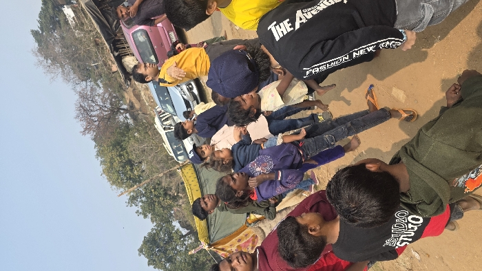 A group of children and adults are laying head-to-toe on a dirt surface outdoors. Some are wearing casual clothing such as jeans, t-shirts, and jackets. In the background, there are cars, trees, and what looks like a tent or awning. The sky is visible and appears clear. It's daytime, and the area is lit by natural sunlight.