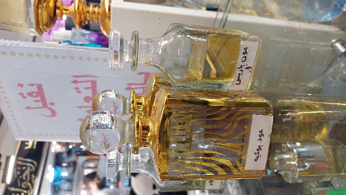 The image depicts a retail display within a shop in Barza Municipality, Syria. In the foreground, four primary perfume bottles are arranged on a clear, reflective surface. Three of these bottles are square-based, featuring a gold metallic wavy pattern and topped with clear spherical stoppers. One such bottle on the left has a white label with "عود بوكيه" (Oud Bouquet) in black Arabic script. To the right, a clear rectangular glass bottle with a flat-top stopper, containing a yellowish liquid, bears a white label inscribed with "مون باريس N" (Mon Paris N) in black Arabic script. In the midground, a white sign with a gold star border displays pink Arabic text, which translates to "We accept collaboration/dealing." To the right of the sign, a golden, multi-tiered decorative object, possibly a lamp base, is partially visible. The background is blurred, showing a brightly lit interior with shelves stocked with various other bottles, some containing blue or purple liquids. On the far left background, a blurred individual with dark hair is partially visible, appearing to be observing items. A black and white object resembling a panda head is also indistinctly visible in the left background. The overall environment suggests a well-lit perfume or cosmetics store.