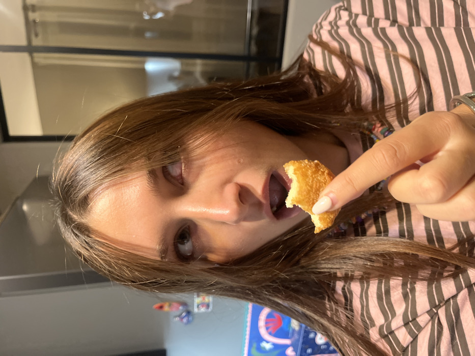 A woman with long brown hair poses in front of a refrigerator while holding a bite-sized piece of food up to her mouth