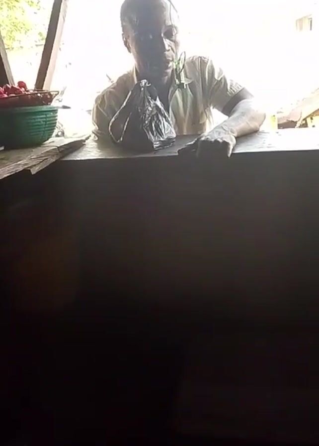 An older man stands behind a counter, holding a dark plastic bag. A green basket filled with red items sits on the counter to his left. The camera then pans down, showing a surface with several white buckets, a metal plate, and other items, all in dim lighting.