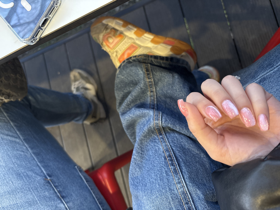 The scene presents a close-up, downward-angled view of two individuals seated in a casual setting in Stara Zagora, Bulgaria. In the foreground, a female's left hand, exhibiting a manicure with pink and white glittered ombre nail polish, rests upon her blue-jean-clad thigh. Her right foot, encased in a white and orange/red Nike Air More Uptempo athletic shoe, is positioned to the right. Directly across or beside, a second individual is partially visible, wearing blue jeans and gray athletic shoes. A red chair leg is discernible beneath the second individual's thigh. The flooring consists of dark gray horizontal planks, consistent with composite decking. A white table edge and a smartphone in a clear case are visible on the far right, resting on the table.