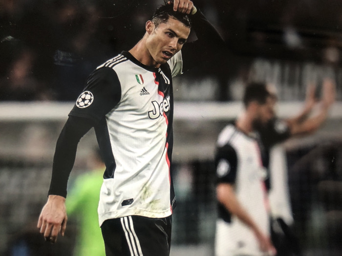 The image captures a male individual, identifiable as Cristiano Ronaldo, wearing a black and white striped Juventus football jersey