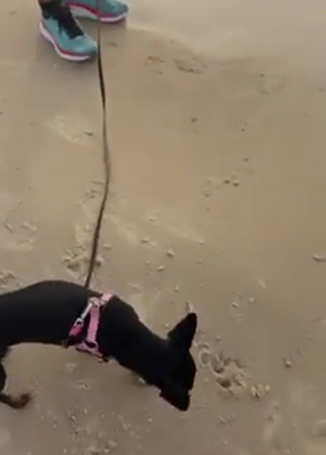 A person walks a black, small-breed dog on a leash along a sandy beach. The person is wearing shorts, a dark-colored top, and running shoes. The dog has a pink harness. The person gestures toward the water’s edge. The camera follows the dog as it explores the sand.