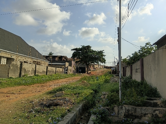 The image depicts a semi-developed residential street in Ikorodu, Nigeria, under a partly cloudy sky