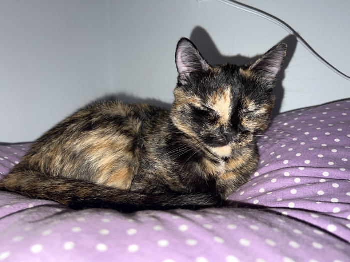 - "A tortoiseshell cat with eyes closed rests on a purple cushion dotted with white polka dots" by FM-qqtRn2, licensed under CC BY 4.0