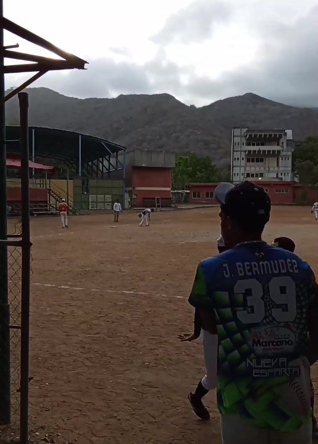 baseball field on a cloudy day with mountains in the background. Several people, presumably baseball players, are scattered around the field. Some are running the bases, while others are standing and watching. One player is seen giving a high-five to another. A man in a blue and green jersey with the name "J. Bermudez" and the number "39" is also visible. The field is surrounded by a chain-link fence, and there is a covered seating area visible in the background. A building is visible to the right. The general atmosphere suggests a casual baseball game or practice session.
