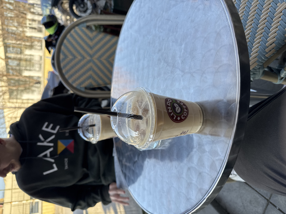 The image depicts an outdoor cafe scene in Pazardzhik, Bulgaria, under natural daylight. Two individuals are present. In the lower left foreground, the upper thigh and leg of one person are visible, clad in dark pants. Opposite, a second individual, male, is seated, with his upper torso partially visible. He wears a dark-colored hoodie featuring a white "LAKE" logo above a red, yellow, and blue geometric design. His head is turned to the right in profile. On a metallic, round outdoor cafe table, two clear plastic cups of iced coffee are present, each with a clear dome lid and a black straw. The cup in the foreground clearly displays a red and white "LINDO COFFEE" logo. The backrest of an outdoor cafe chair, woven with light blue and beige diagonal patterns, is visible on the right side of the table. The background, out of focus, reveals bare tree branches, blurred light-colored buildings, and parked vehicles, including a motorcycle with a yellow-green helmet.