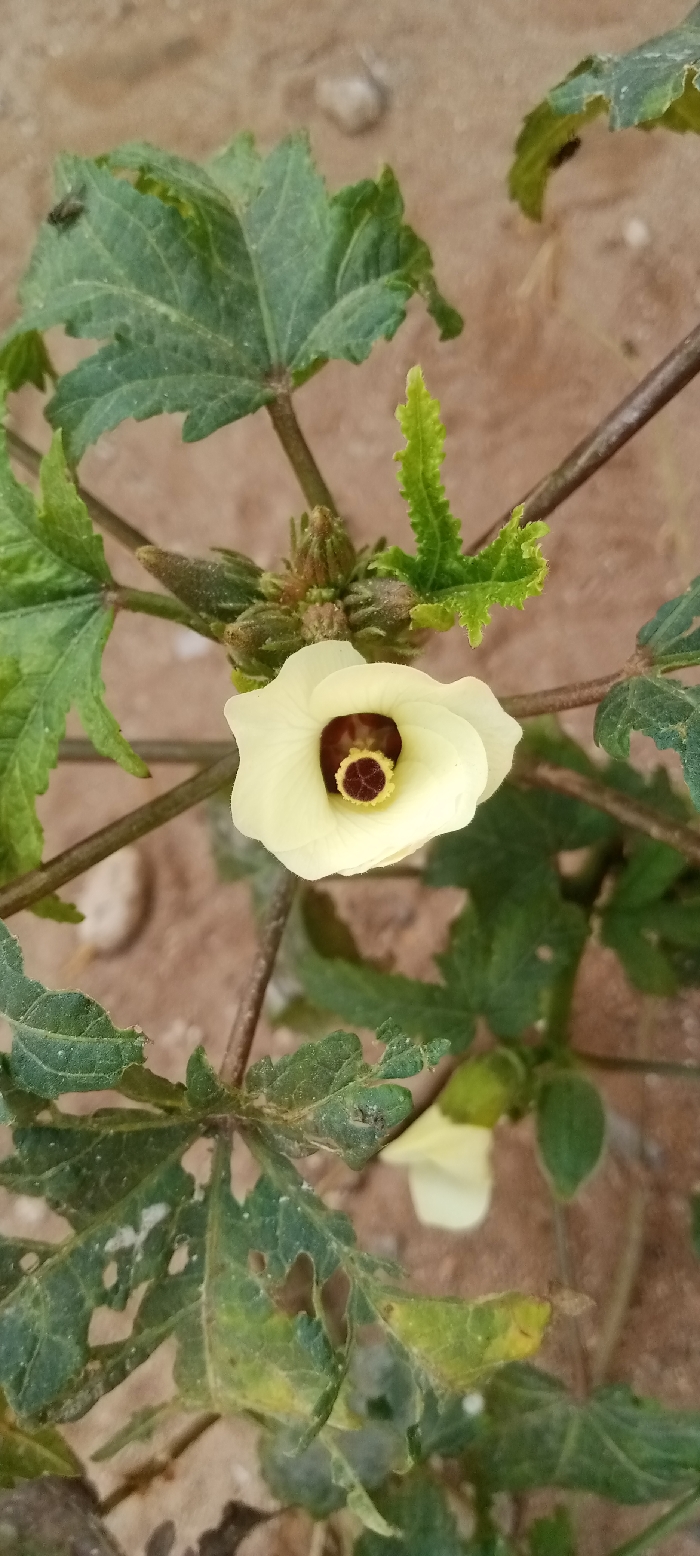 This image depicts a close-up of an okra plant located in Kwamba, Nigeria