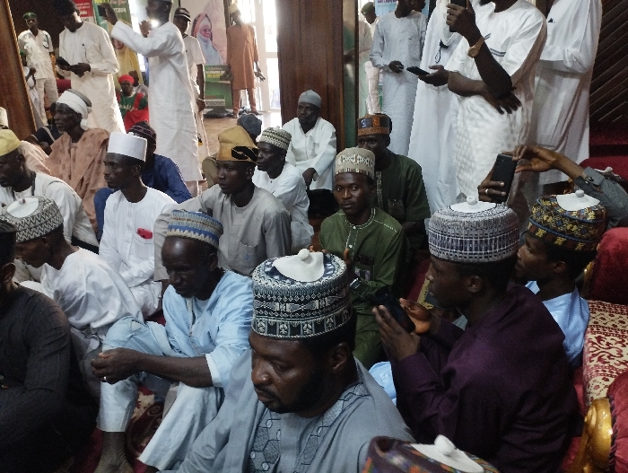 The scene is an indoor gathering of men in Kaltungo, Nigeria (latitude: 9.816, longitude: 11.315). The majority of the men are wearing traditional white, flowing robes called "jalabiya" or "kaba" and some are wearing white skullcaps. They are seated in rows on wooden benches, in front of a decorative wall. A few men are standing in the back, most of whom are also wearing traditional robes. Some are holding cellphones. The room appears to be a reception hall or meeting space, with some of the men engaged in conversation and a few taking pictures.