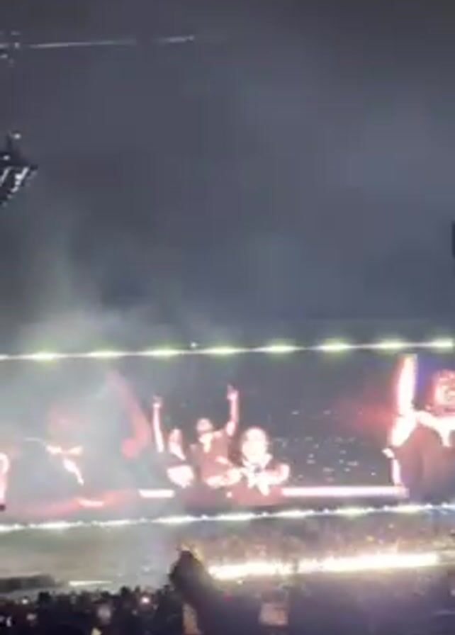 A live performance is underway. On a stage, silhouetted figures perform, likely musicians or performers. Large screens behind them display images, adding to the visual spectacle. The venue is packed with people, many holding up phones, presumably to record the event. The lighting is dramatic, with bright spotlights and what appears to be smoke or haze creating a dynamic atmosphere. A large rigging structure hangs above the stage, supporting lights and other equipment.