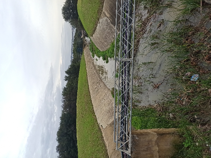 A narrow, sluggish stream flows between manicured grassy banks and concrete barriers. A metal pipe bridge crosses the waterway. The water is murky, with sparse green vegetation emerging from it. Debris and litter are visible along the bank. Overcast sky obscures the horizon, and dense trees line the upper edges of the landscape.