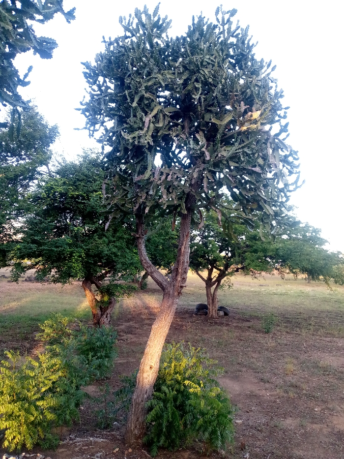 A landscape featuring several trees under a bright sky. A tall, distinctive tree with a textured, possibly cactus-like canopy dominates the center. To its left, a smaller tree with dense green foliage stands beside low-lying shrubs. Further back, two tires sit under another tree. The ground appears dry and sparsely covered with grass. The lighting suggests either early morning or late afternoon.