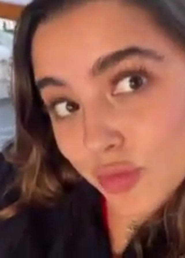 A young woman with brown hair is holding a drink and taking a sip from a straw while facing the camera