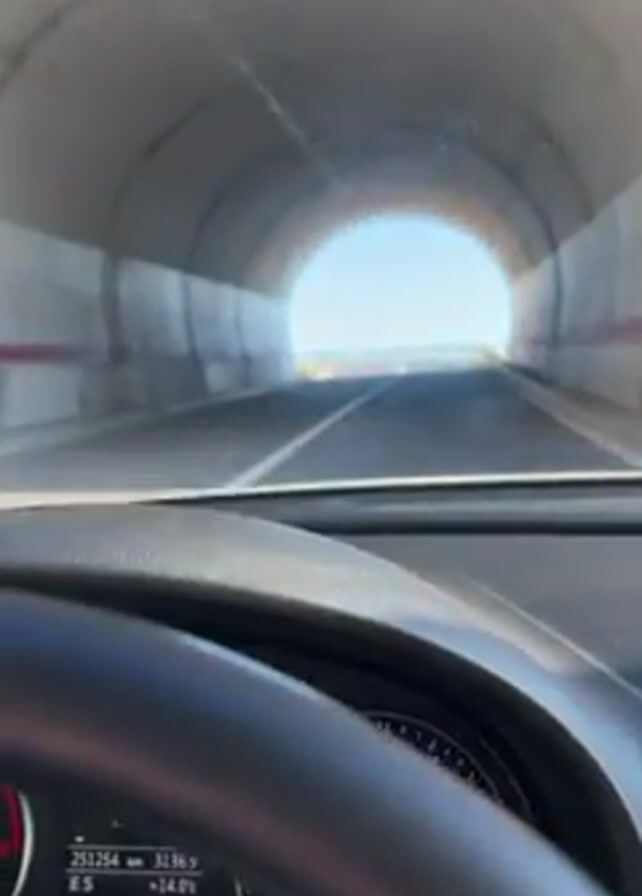 The camera is mounted inside a car driving on a scenic coastal road. The car enters a tunnel, and the light grows brighter as it nears the exit. After emerging, the view opens up, revealing the winding road ahead with a car in the distance. A rocky cliff face lines one side of the road, and a clear blue sky is overhead. The interior of the car, including the dashboard and steering wheel, is partially visible. The car is traveling on a sunny day.