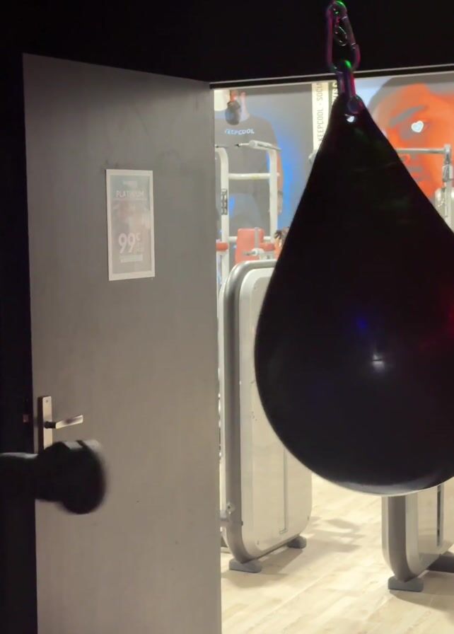 A medium shot captures a man with curly hair wearing a white and light green t-shirt, punching a black teardrop-shaped punching bag in what appears to be a gym. The man is wearing black boxing gloves. The punching bag hangs from a chain attached to the ceiling. The background is slightly blurred, but it shows exercise equipment and a promotional poster. A partially open gray door frames the scene. A sign on the door advertises a platinum membership for 99 dollars. The lighting is dim.