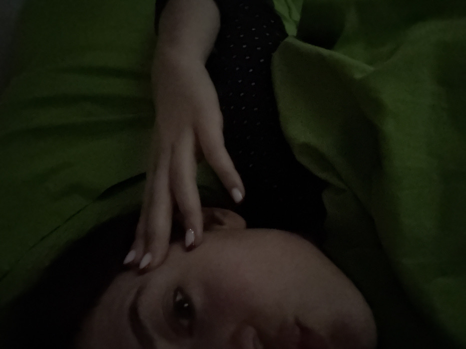A female subject is depicted in a close-up, dimly lit, indoor setting. Her face occupies the left portion of the frame, showing her right eye open and her lips slightly pursed. Her right hand, featuring light-colored nail polish on the fingernails, is positioned across her upper face, with fingers extending towards her right temple. She is partially covered by or wearing green fabric, with a section of dark, possibly black, fabric with a subtle polka-dot pattern visible beneath her right arm. The specific location within the city of Tbilisi, Georgia, is not discernible from the image content.