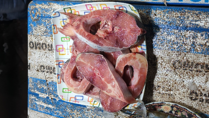 Slices of raw fish steaks are piled on a patterned rectangular plate