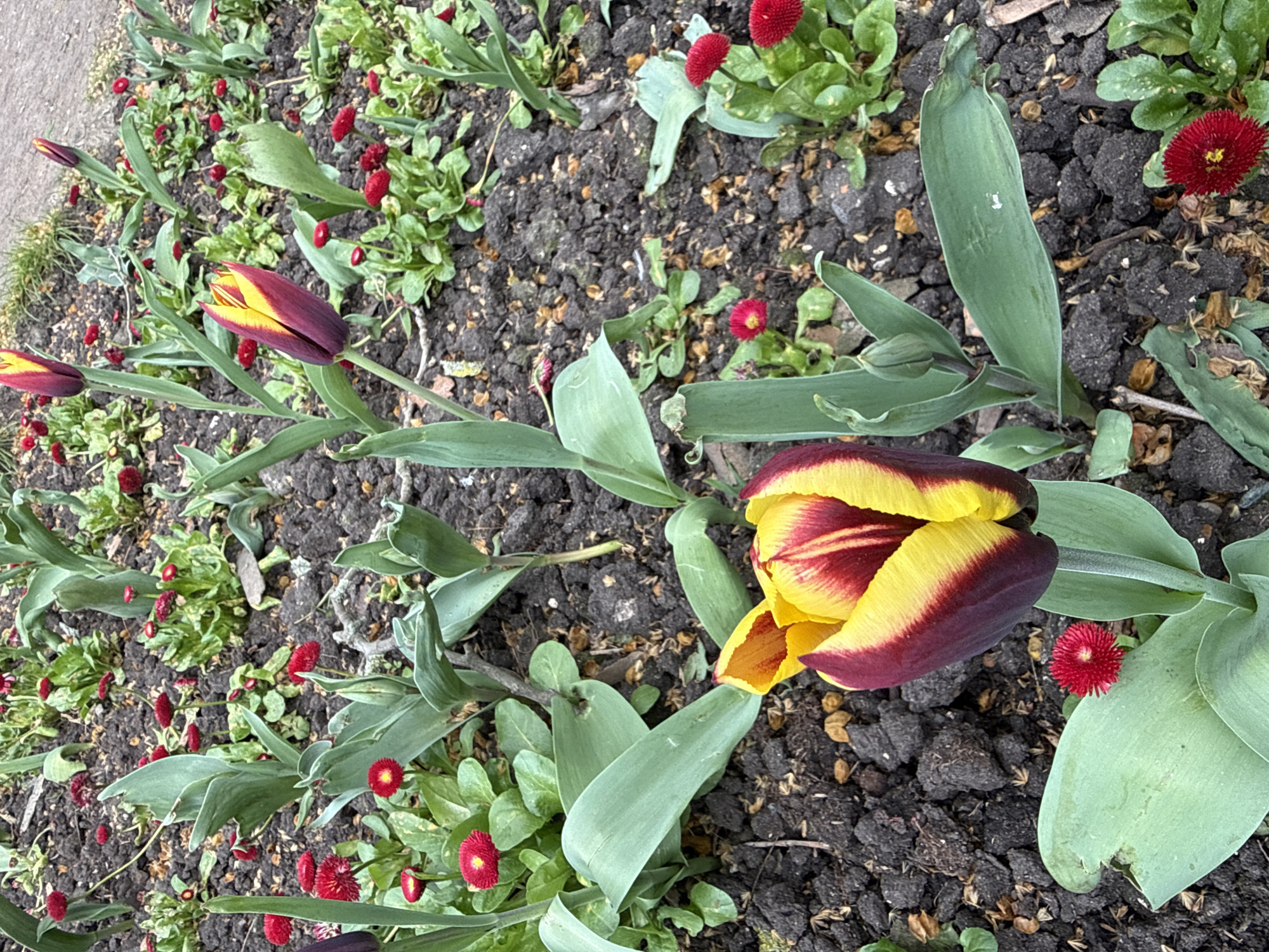 A close-up, eye-level shot displays a garden bed filled with blooming flowers. The primary focus is on several tulips featuring a color gradient of dark purple merging into bright yellow. Some tulips are still in bud, while others are partially or fully open. Interspersed among the tulips are smaller, bright red flowers with yellow centers, surrounded by small green leaves. The flowers are growing in dark, moist soil. The scene is captured in natural lighting. No people are visible. The location cannot be determined from the image provided.