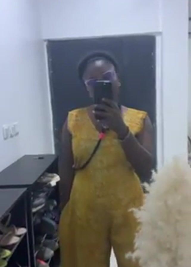 A person is standing in front of a mirror taking a selfie with a smartphone. The person is wearing a yellow patterned jumpsuit, glasses, and a headband. A black purse strap is across the chest. Behind the person is a black shoe rack filled with shoes, a closed dark grey door, and some home décor in the corner. The background is white and lit by natural light. The camera moves slightly during the recording.