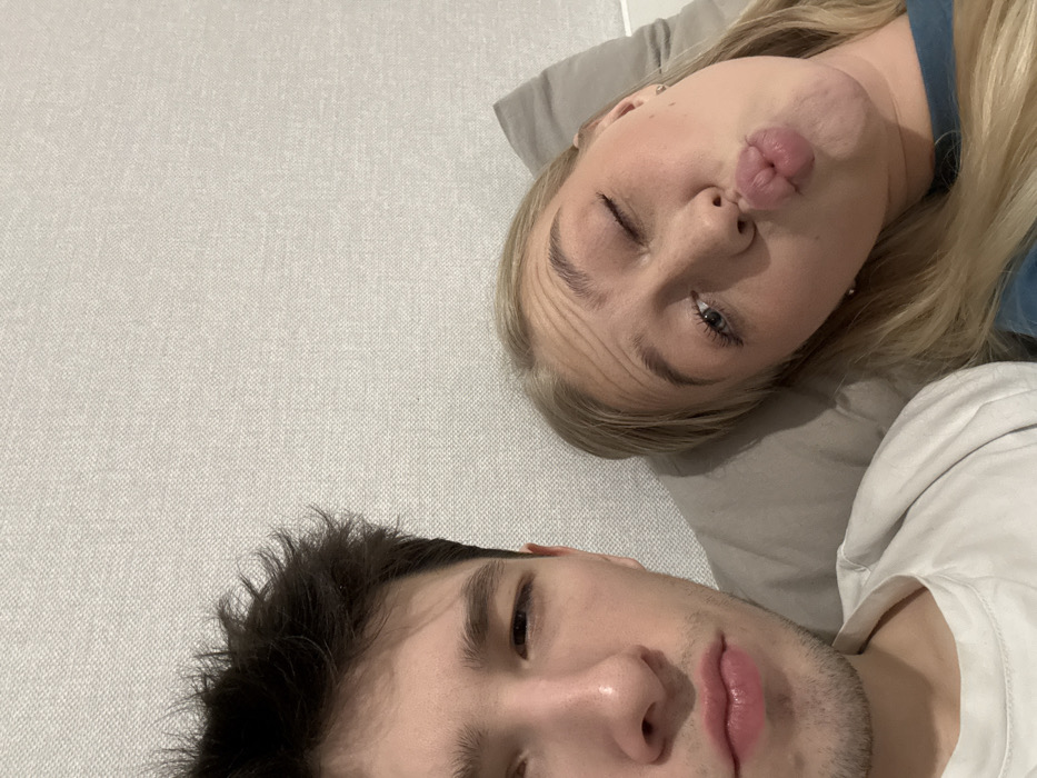 The image displays two young adults in an indoor setting within the city of Yanino-1, Russia. On the left, a male with dark, disheveled hair and light skin is partially visible, wearing a white t-shirt. His left eye is open, and his lips are formed in a pout. On the right, a female with long blonde hair and light skin is positioned slightly lower and to the right, with her head resting on a light gray pillow. She is shown winking with her right eye closed and her lips are puckered. Both individuals appear to be facing the camera. The background consists of a plain, light-colored wall with a subtle textural pattern.