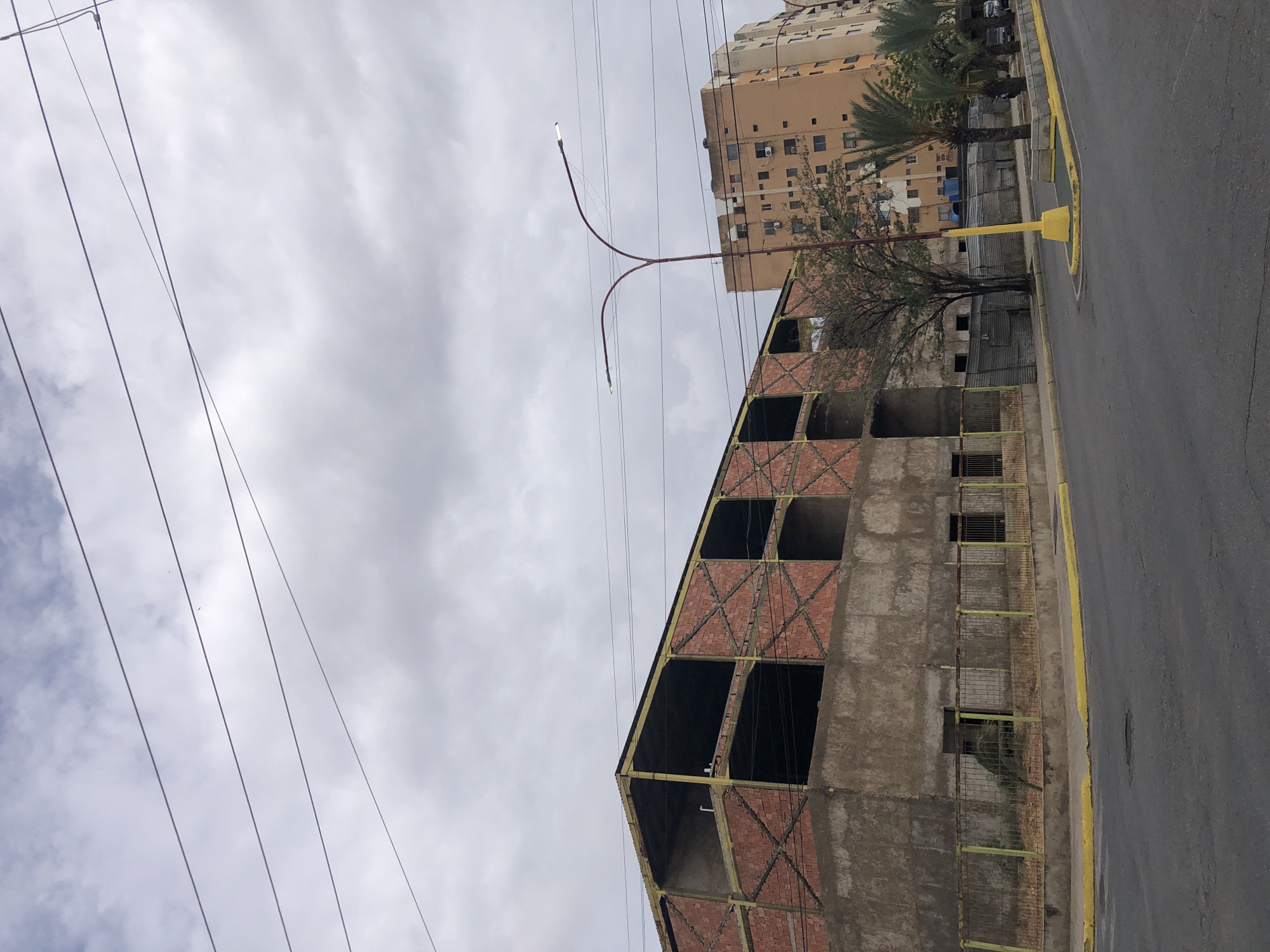An eye-level outdoor shot shows an unfinished building on a street in the city of Juan Griego, Venezuela. The unfinished building is approximately five stories high with an unfinished brick exterior and steel supports. The street runs parallel to the building and has a yellow curb. In the background is a multi-story building with many windows, a street lamp, and power lines. The sky is overcast.