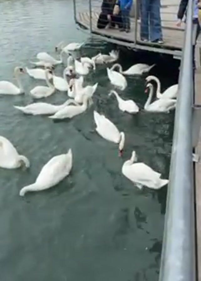 - "large group of swans swimming in water next to a wooden dock where people are feeding them" by FM-S1vTW2, licensed under CC BY 4.0