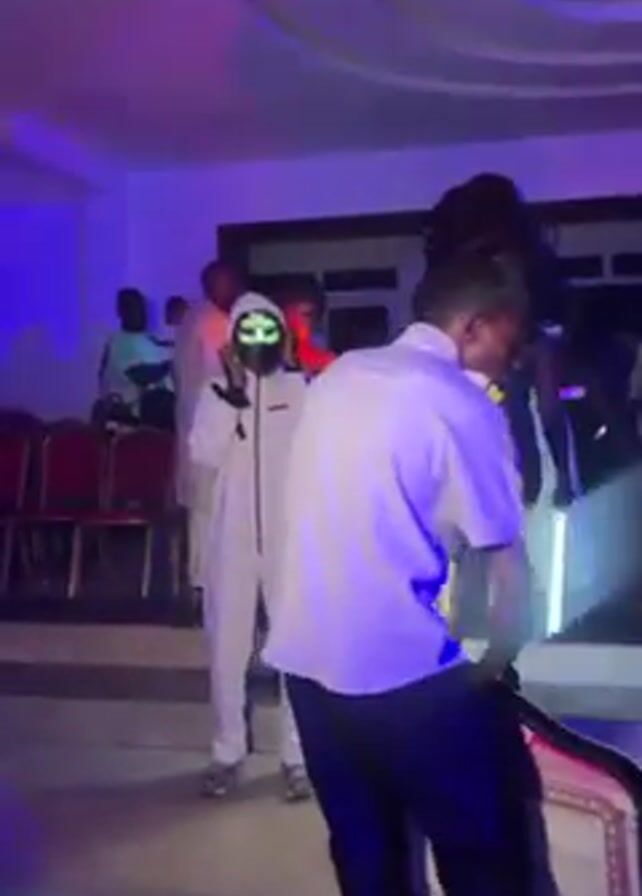 A medium shot shows a group of people at what appears to be a party. A person in a white jumpsuit and a mask with glowing green eyes is standing in the middle of the shot. Other people are moving around in the background, some on a slightly raised platform. The lighting is dim, with shades of purple and blue. Several red chairs are stacked against a wall in the background. The person in the white jumpsuit seems to be the focus of attention.