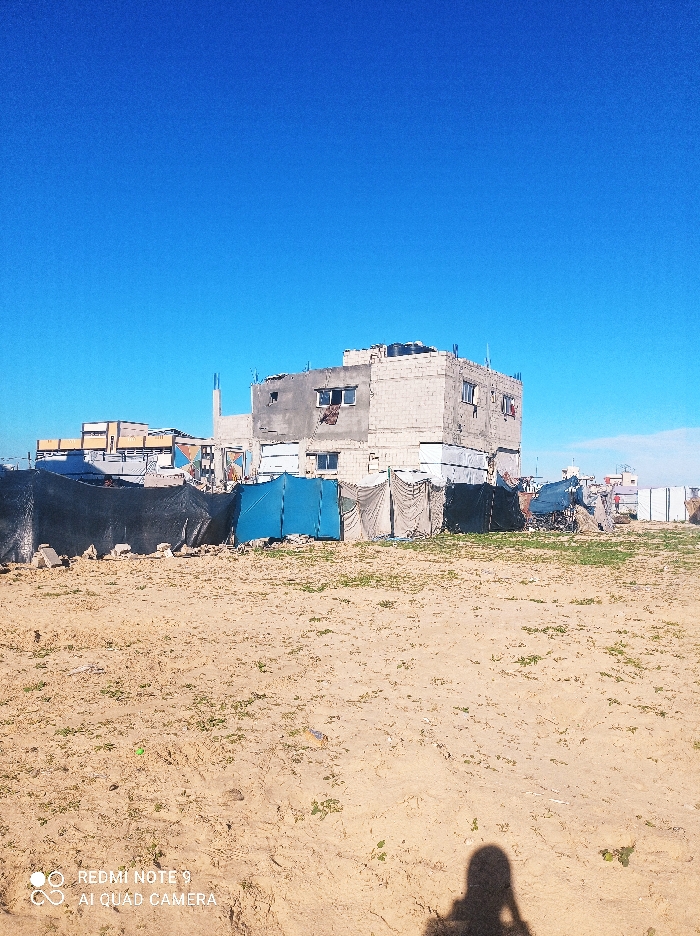 The image depicts an outdoor scene in Khan Yunis, Palestinian Territory, under a clear blue sky. The foreground consists of sandy, light brown earth sparsely covered with green vegetation and marked by footprints. The shadow of a person, presumably the photographer, is visible in the lower right, with a "REDMI NOTE 9 AI QUAD CAMERA" watermark in the lower left. In the mid-ground, a multi-story building constructed from light-colored concrete blocks stands prominently. This structure appears to be either unfinished or damaged, exhibiting exposed blockwork, multiple window openings (some vacant, others covered), and rebar protruding from the roof. Several water tanks are present on the roof. In front of and around this building, a dense collection of makeshift shelters or tents is visible. These structures are fabricated from various materials, including blue and black tarpaulins, fabric sheets, and what appears to be salvaged corrugated metal, forming an informal camp. The background shows additional, more distant buildings, partially obscured by the closer structures and shelters. No individuals are explicitly visible within the scene.