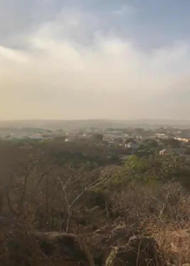 view of a city from atop a rocky hill. The sky is partly cloudy and hazy, and the city is visible in the distance. There are trees and other vegetation in the foreground. The video appears to be taken during the day.