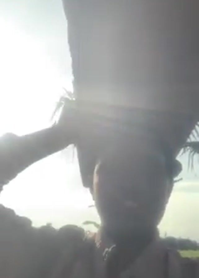 A person stands in a sunny outdoor environment. They have something large and flat balanced on their head, which obscures much of their face but allows their expression to be seen. In the background, there is a field and a palm tree. Another person can be seen in the distance. The video seems to be taken at ground level.