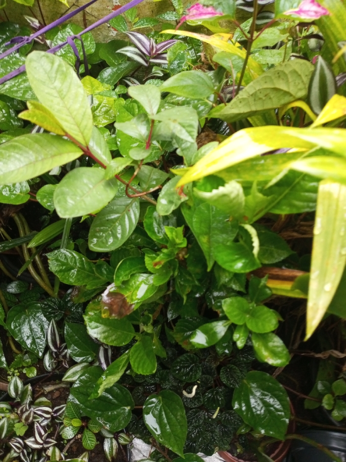 Lush greenery fills the frame, a vibrant tapestry of varied plants. Shiny, verdant leaves glisten, intermingled with striped foliage in shades of purple and white. Red stems add contrast to the predominantly green scene. Hints of yellow suggest other plant varieties within the dense arrangement. Water droplets cling to the surfaces, adding to the overall freshness and vitality.