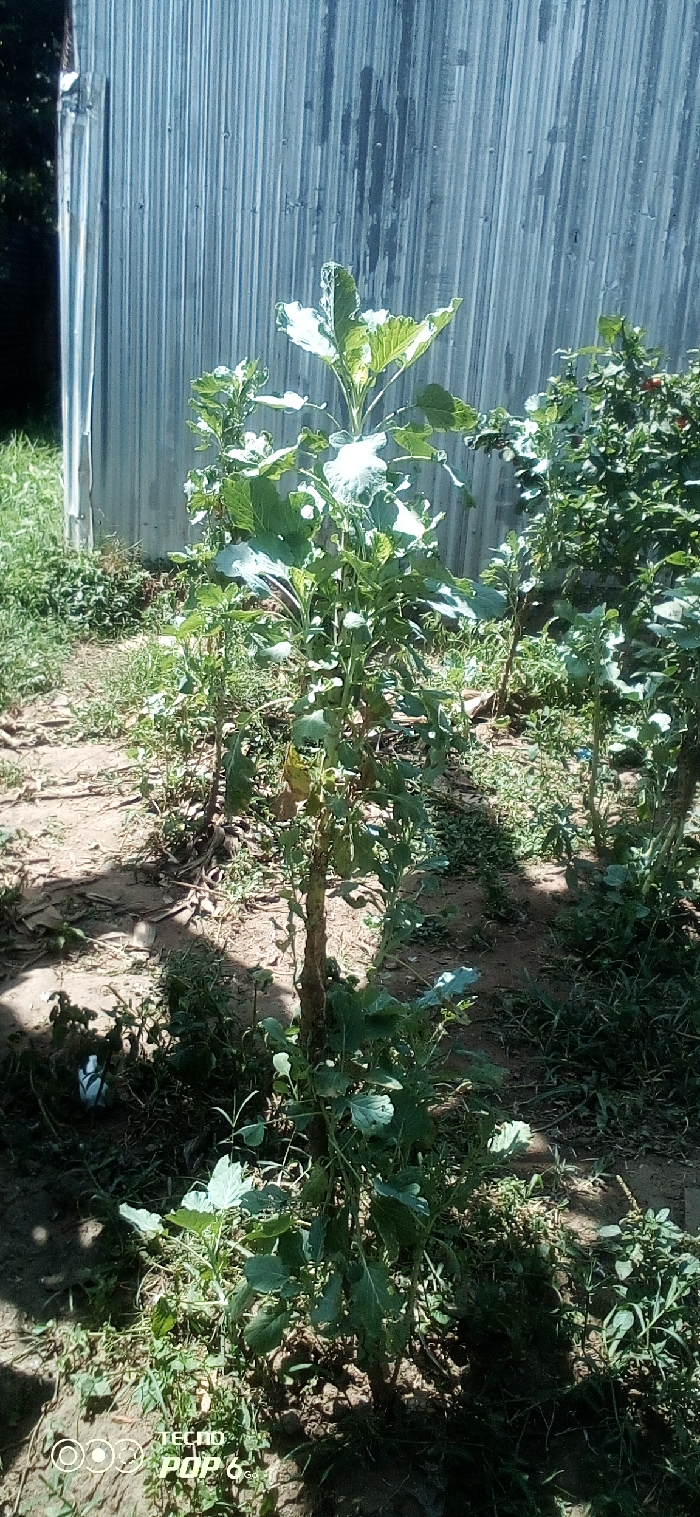 The scene, located in Mahiakalo ward, Kenya, depicts an outdoor cultivation area under direct sunlight. In the foreground and midground, several green plants are established in reddish-brown, partially bare earth. A prominent, tall leafy green plant, consistent with Brassica species, stands centrally with broad, verdant leaves. To its right, other green plants are visible, including one exhibiting small red fruits. The ground features patches of sparse green weeds, exposed soil, and cast shadows. The background consists of a weathered corrugated galvanized iron sheet wall, characterized by vertical ridges and a dull metallic gray finish with darker streaks. To the far left of the wall, a section of dark green foliage is visible. No people, actions, or interactions are present.