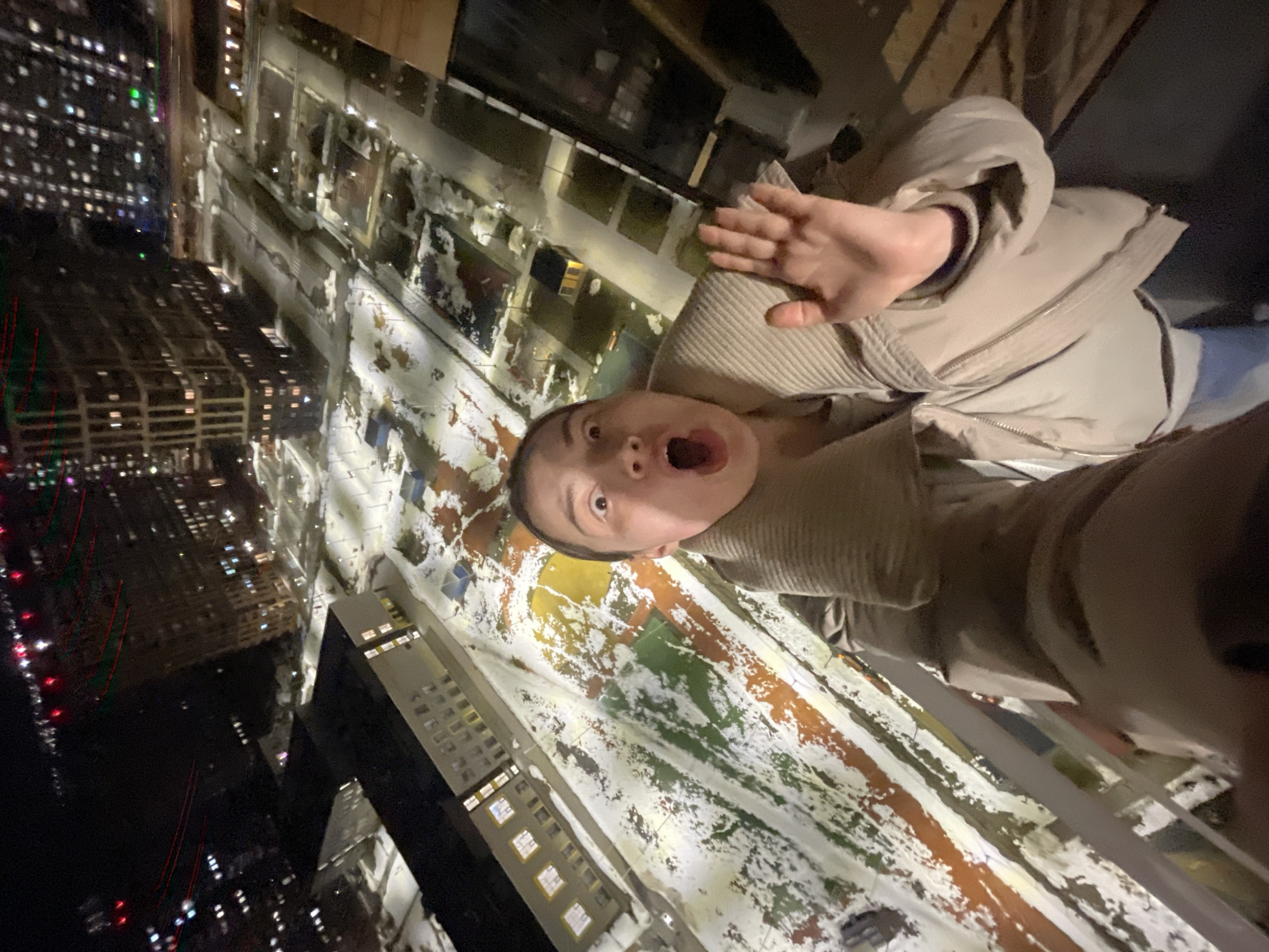 An overhead, wide-angle, low-light image captures a person from a high vantage point overlooking an urban area in Balashikha, Russia, at night. **People:** A single individual is visible, centered in the lower-middle of the frame. The person has light skin, dark hair pulled back, and is wearing a light beige or tan puffer jacket with a ribbed high collar, possibly part of the jacket or a separate garment. Light-colored pants are partially visible below the waist. The individual's face is directed towards the camera with a wide-open mouth forming an 'O' shape, and wide eyes, indicating a surprised or vocalized expression. Their right arm is extended towards the camera, palm open with fingers splayed, as if in a gesture of stopping or emphasis. The image is taken from a selfie perspective, suggesting the individual is holding the camera. **Objects:** The individual is positioned near a structural element, possibly a railing or ledge, of the building from which the photograph is taken. **Environment (Balashikha, Russia):** The background reveals a densely built urban landscape at night. * **Illumination:** The scene is illuminated by artificial lights, including numerous windows in residential buildings, streetlights on the ground, and distant red and green lights against the dark sky. * **Ground Cover:** Patches of snow are visible on the ground, indicating cold weather conditions. * **Structures:** Multiple high-rise residential buildings, illuminated from within, dominate the mid-ground and background. One prominent building features a grid-like facade. A lower, rectangular building with evenly spaced, illuminated windows is present to the left. * **Ground Features:** Below, a complex of open spaces and courtyards is visible. These areas feature distinct, contrasting colored markings on the ground—specifically, large sections of green, yellow, and orange/brown, which appear to be painted surfaces like sports courts or decorative elements, interspersed with snow and paved pathways. Small structures resembling sheds or kiosks are scattered across these ground areas. Roads or wide paths are also discernible. * **Perspective:** The image is taken from a significant height, providing an aerial view of the city block.
