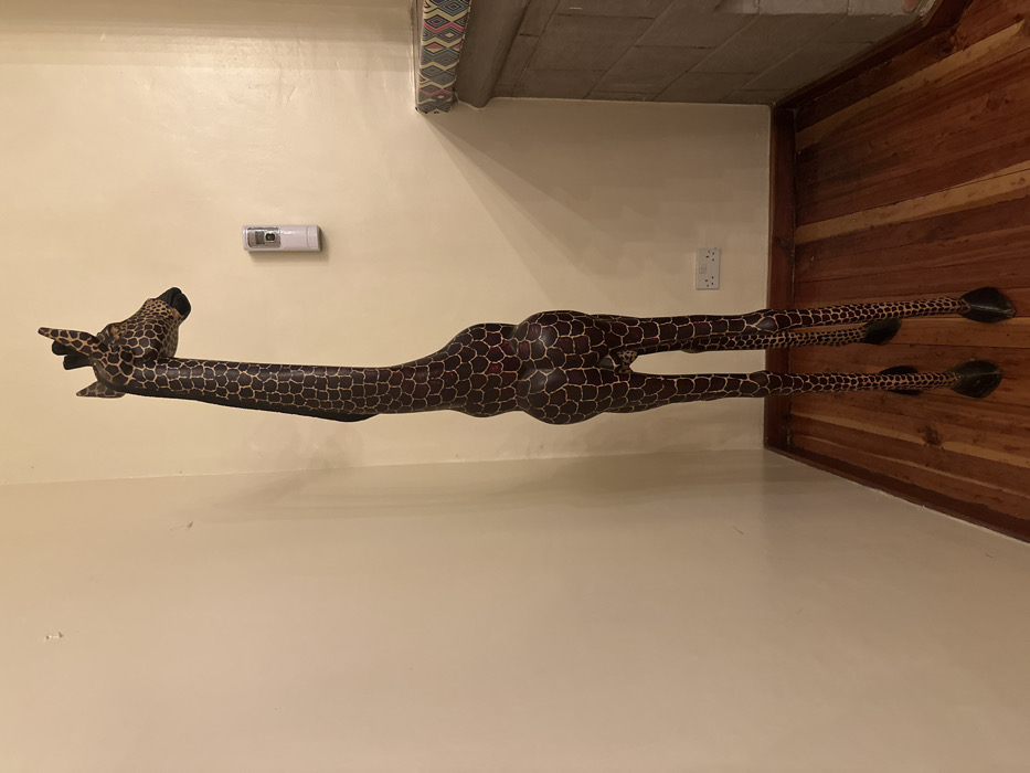 A carved, wooden giraffe figurine stands on a light-colored floor against a beige wall