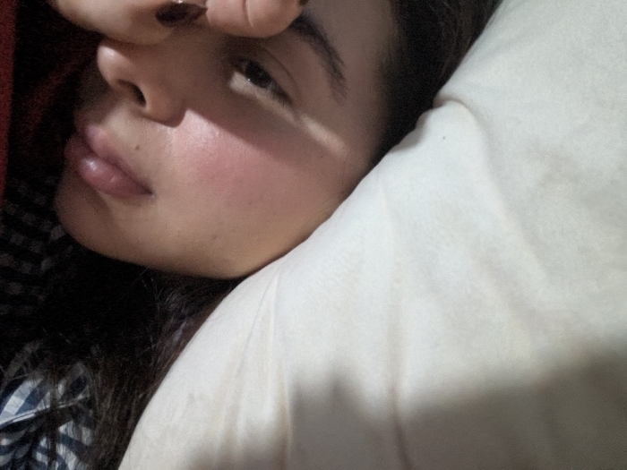 A close-up photograph captures the right side of a person's face, reportedly located in Juan Griego, Venezuela. The individual, appearing to be a female, is depicted resting their head on a white, textured pillow that occupies the right half of the frame. The right eye is partially open, revealing dark eyelashes, possibly enhanced. The lips are slightly parted. A distinct shadow traverses the upper face diagonally from the upper left, obscuring portions of the forehead, right eye, and upper cheek. A hand, showing a thumb with dark nail polish and an index finger, is positioned over the upper-left forehead and nose area. Dark hair is visible extending from behind the head on the left. A dark garment with a light checkered pattern is present on the far left, partially obscured by the hair. A sliver of dark red fabric is also visible in the upper left corner. The background is indistinct beyond these elements.
