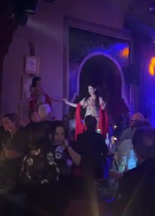 The video captures a vibrant nightclub atmosphere. On a raised platform, two dancers, one wearing a red shawl, perform for a crowd of people. The club is illuminated by blue and orange lighting, accentuated by a large chandelier. In the background, a band can be seen playing. Some people in the crowd are standing while others sit at tables, where bottles are visible.