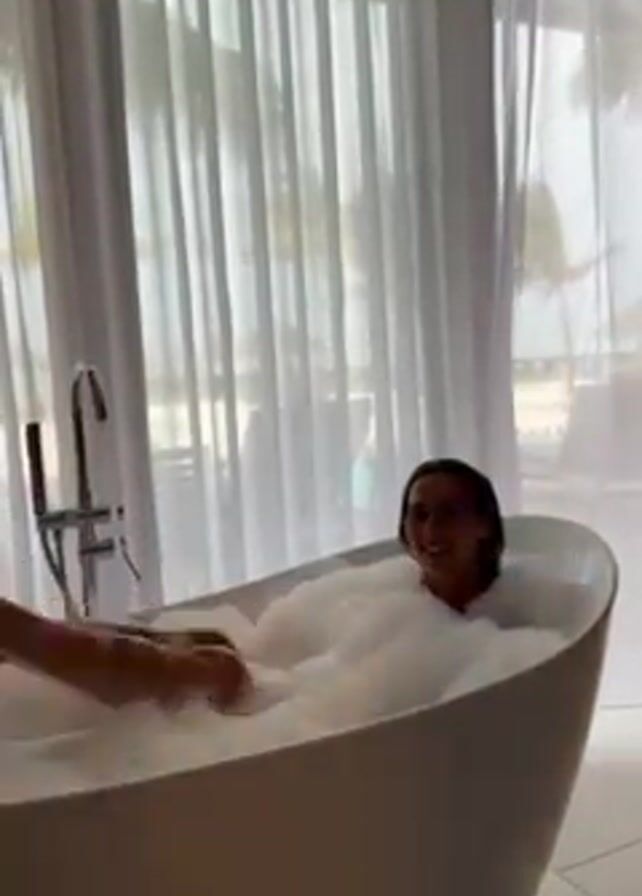 A woman is lying in a freestanding, white bathtub filled to the brim with bubbles. Her head and torso are visible as she smiles toward the camera. Another person’s legs are visible near the camera, with feet submerged in the bubbles. The bathtub is positioned in front of a large window covered with sheer white curtains. The view through the window reveals a beach scene. A modern-looking faucet is situated at one end of the bathtub.