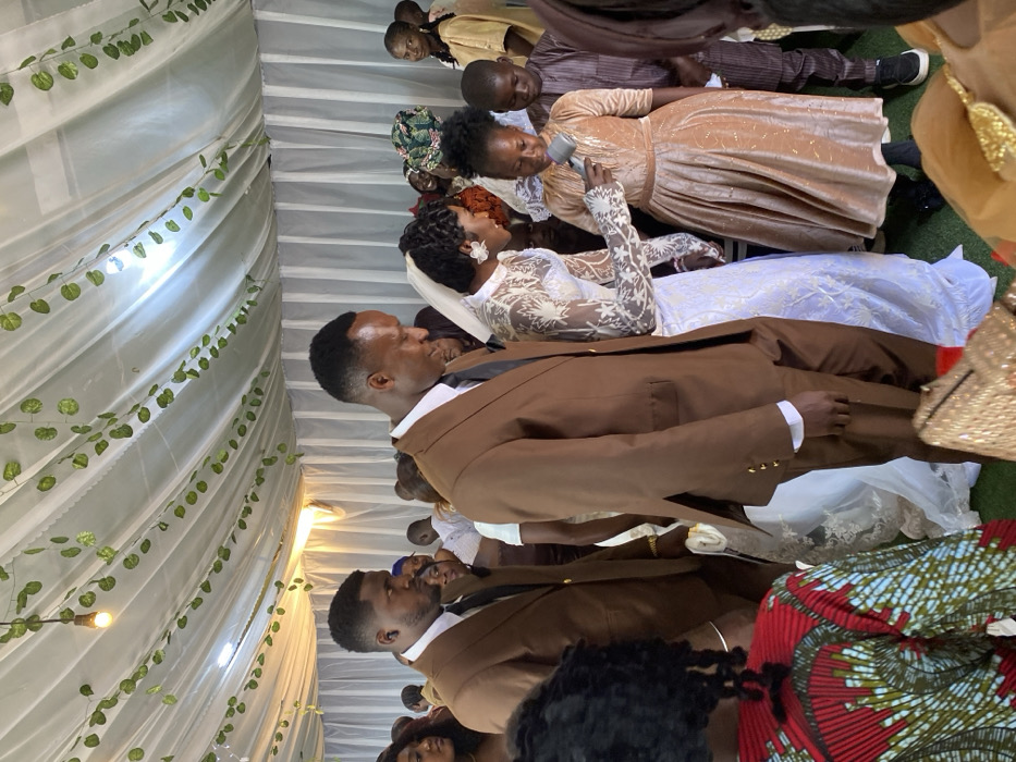 This image depicts an indoor wedding ceremony or reception taking place under a white canopy structure. The ceiling is draped with white fabric, adorned with strings of artificial green leaves, and illuminated by exposed incandescent bulbs. The floor is covered with green turf. In the foreground, a groom dressed in a brown suit and black tie stands with his head bowed, positioned next to a bride wearing a white lace wedding gown and a veil. The bride extends a small, silver-colored microphone towards a young girl in a long, light brown, shimmering dress, who is looking intently at the microphone. To the groom's left, another male, similarly dressed in a brown suit and black tie, stands observing the scene. Numerous guests, including adults in traditional attire and children, are visible in the background, observing the central figures. This event is located in Jos, Nigeria.