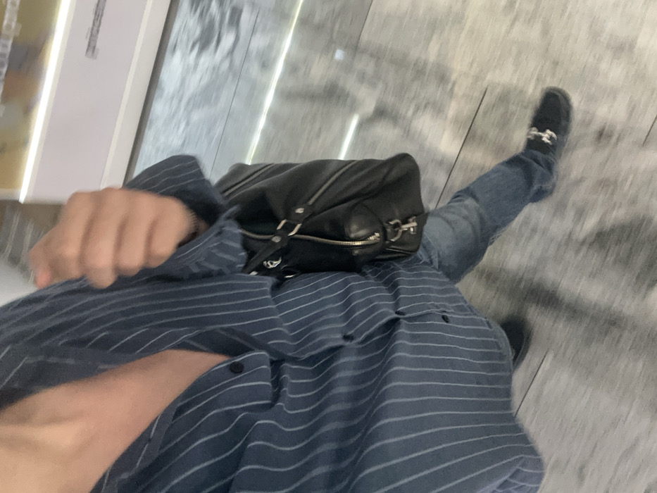 A single individual is depicted from a high-angle, mid-shot perspective, encompassing their torso, right arm, legs, and feet. The person wears a dark blue pinstriped button-down shirt, unbuttoned at the collar, light blue denim jeans, and dark slip-on shoes or loafers with a silver-toned metallic buckle on the visible right foot. A black leather handbag with prominent silver-toned zippers and hardware is carried on their right side. The individual is in motion, evidenced by the blur around their lower body and the environment. The setting is an indoor commercial space with a light-colored, reflective floor exhibiting a subtle grey pattern. The background consists of a blurred, illuminated display or wall section featuring horizontal white and light beige elements, consistent with a shopping mall or large retail store. No specific identifying features of a location within Mexico City, Mexico, are discernible from the visual evidence.