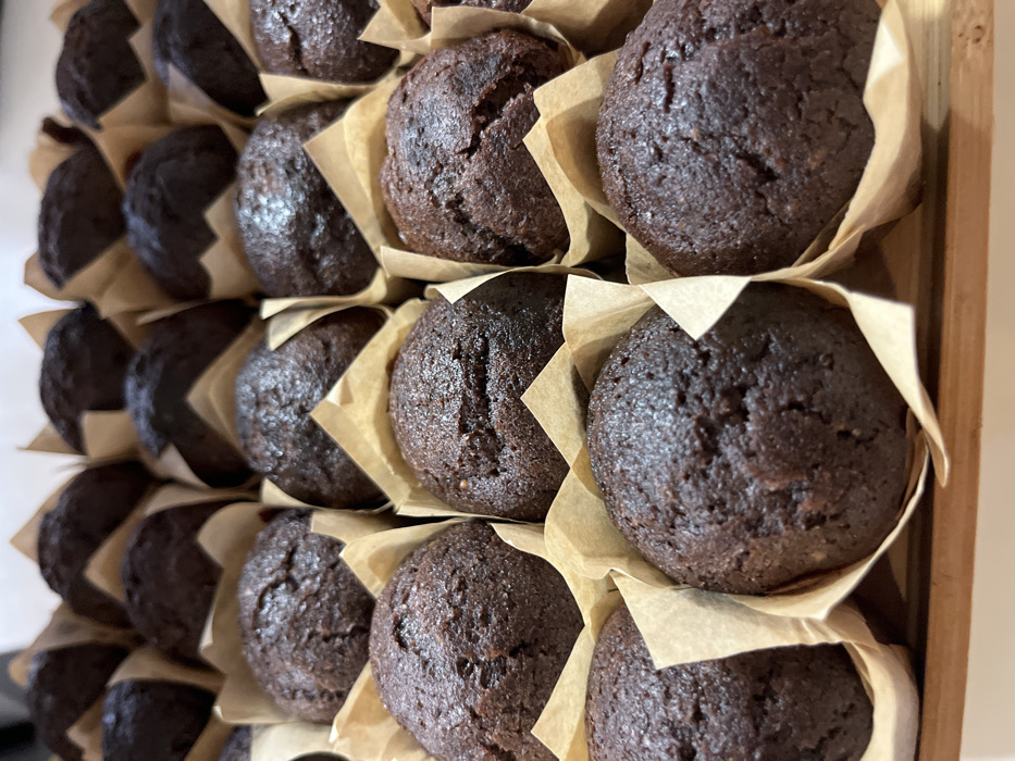 close-up of a tray of chocolate muffins, which appear to be freshly baked, in a bakery or cafe in Telde, Spain