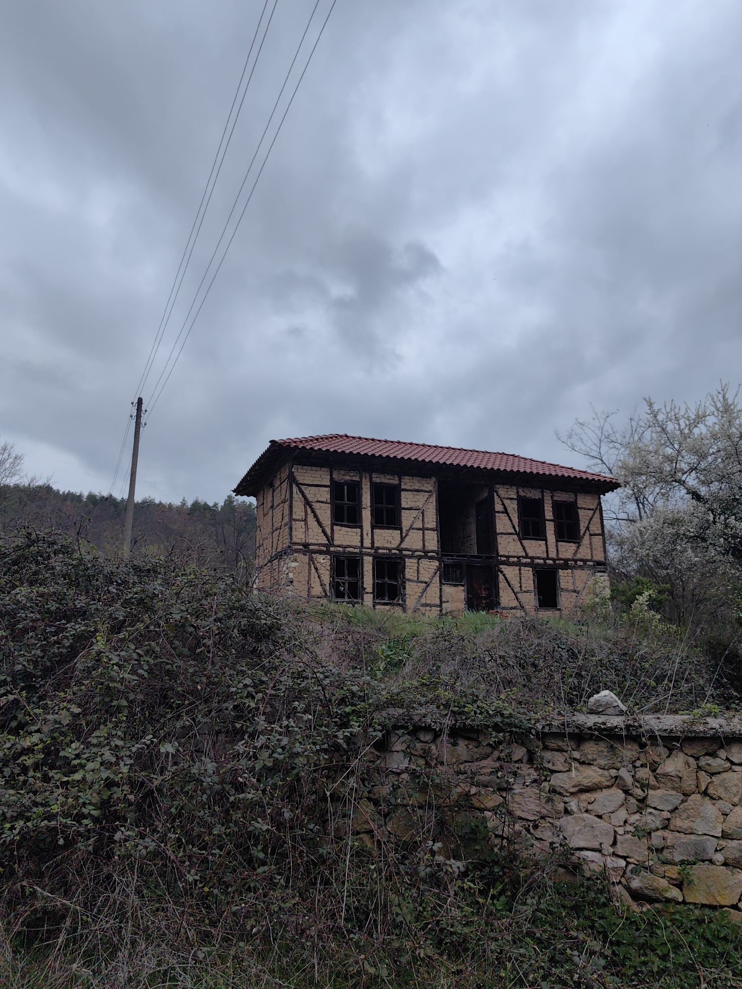 A weathered, two-story building stands on a slight rise, surrounded by overgrown vegetation and a stone wall. The building is constructed of brick and timber, with a red-tiled roof. All windows are open and empty. A telephone pole is situated to the left of the structure. The sky is overcast and cloudy. Based on the architectural style and the surroundings, it is possible this image was taken in the Slatina region of Bulgaria.