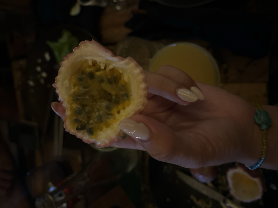 A person's right hand, with light-toned skin and light nude-colored fingernails, holds an open half of a passion fruit