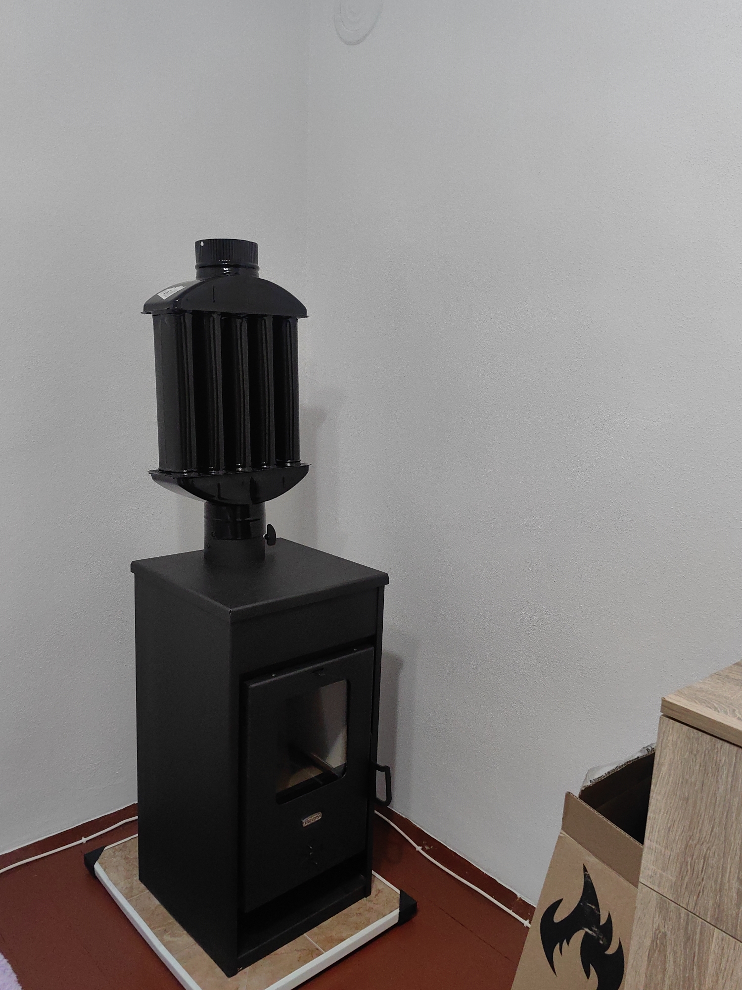 A black wood-burning stove is centrally located in the frame, positioned in the corner of a room with light gray walls. The stove sits on a square tile base, which rests on a red linoleum floor with white baseboards. To the right of the stove, the edge of a cardboard box with a black flame design is visible, partially obscured by a light wood-grained cabinet. A white electrical outlet is visible in the upper left corner of the image. The scene is indoors. There are no people visible in the image. The image contains no information that it is taken in Sennik, Bulgaria.