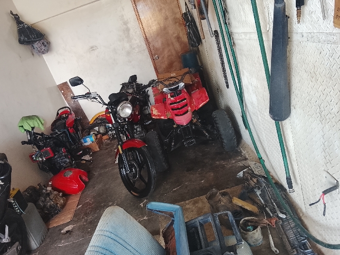 The image displays a cluttered indoor space, likely a garage or workshop. The walls are light-colored, with the right wall exhibiting a diamond plate texture. The concrete floor is uneven, stained, and covered with debris and miscellaneous items. No individuals are present in the scene. A red street motorcycle, featuring black wheels and a circular headlight, is centrally positioned and upright. Directly behind it is a red four-wheeled All-Terrain Vehicle (ATV) with black tires. To the left, a second, partially disassembled motorcycle, primarily black, stands; its detached red fuel tank rests on a cardboard sheet on the floor in front of it. A green fabric is draped over the rear of this motorcycle. The right wall holds several hung items, including a long green hose, a black elongated object (possibly a case or tool), and various metal tools. The foreground of the floor is occupied by numerous objects: a light blue, possibly upholstered vehicle component, a white bucket containing items, various metal parts, a yellow wooden block, and a black gridded object. In the upper left background, a dark, bundled item hangs from the wall. A closed wooden door is visible in the rear background. The specific location within the city of San Antonio, Venezuela, cannot be determined from the visual evidence provided.