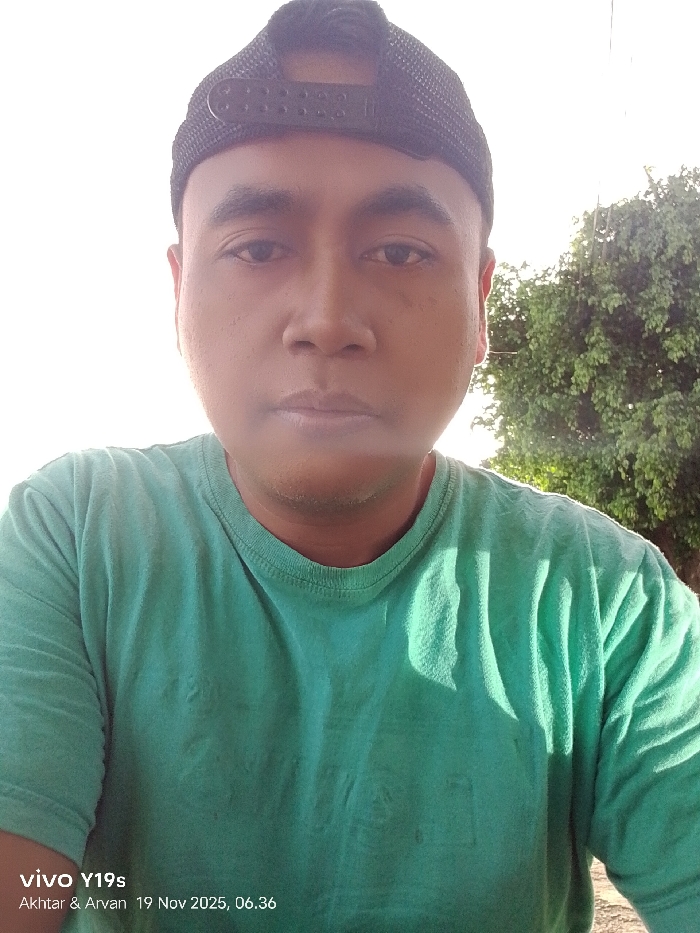 A person wearing a black baseball cap and a green t-shirt is centered in the frame. The background is bright, possibly outdoors with some foliage visible on the right. The individual's face is prominent, showing neutral expression. The image appears to have been taken with a smartphone, as indicated by the watermark at the bottom left displaying the phone model and timestamp.