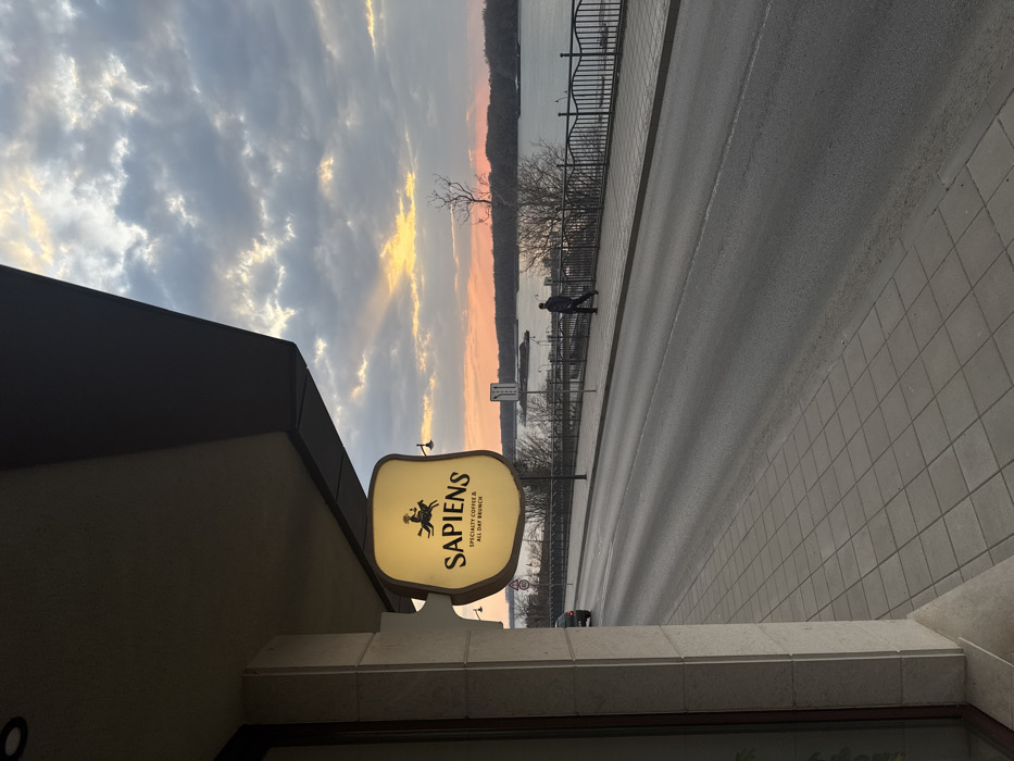 The image depicts an outdoor urban scene in Ruse, Bulgaria, specifically facing east along ul. "Borisova" 2, overlooking the Danube River. In the immediate foreground on the left, a portion of a building with light-colored stone cladding is visible, topped by a dark, overhanging structure. A prominent, illuminated, bread-shaped sign for "SAPIENS SPECIALTY COFFEE & ALL DAY BRUNCH" hangs from this building. The sign features a dark silhouette logo of a figure riding an animal against a warm yellow glow. A two-lane asphalt road runs horizontally through the midground. To the left of the road, a sidewalk with square grey tiles is present. A dark-colored vehicle is partially visible on the left lane of the road, moving away from the viewer. To the right of the road, a wider promenade, paved with light-colored rectangular slabs, is bordered by a dark metal railing. A single male figure, dressed in dark attire, walks on this promenade, also moving away from the viewer. The background features the broad expanse of the Danube River, with its far bank lined by bare trees. The sky above is partly cloudy, displaying a gradient of grey clouds and clearer patches. A distinct orange and yellow glow, with visible sunbeams, emanates from the low horizon, characteristic of either sunrise or sunset. Several streetlights and a red circular traffic sign are visible along the road and promenade.