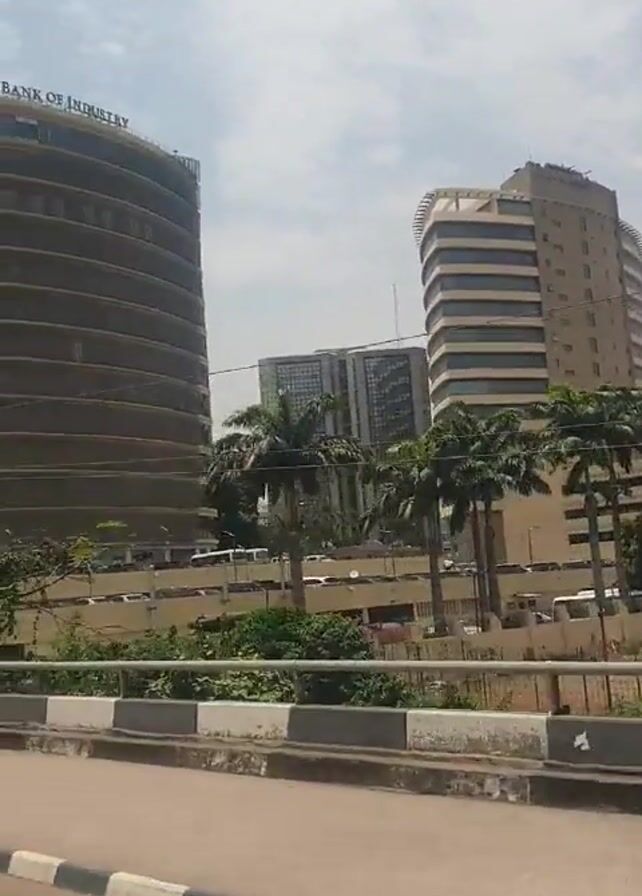 view from a moving vehicle driving past buildings. The Bank of Industry building is visible, along with other high-rise structures and palm trees. A man walks along the sidewalk. The roadside is marked with a black and white curb. The sky is bright with some clouds.