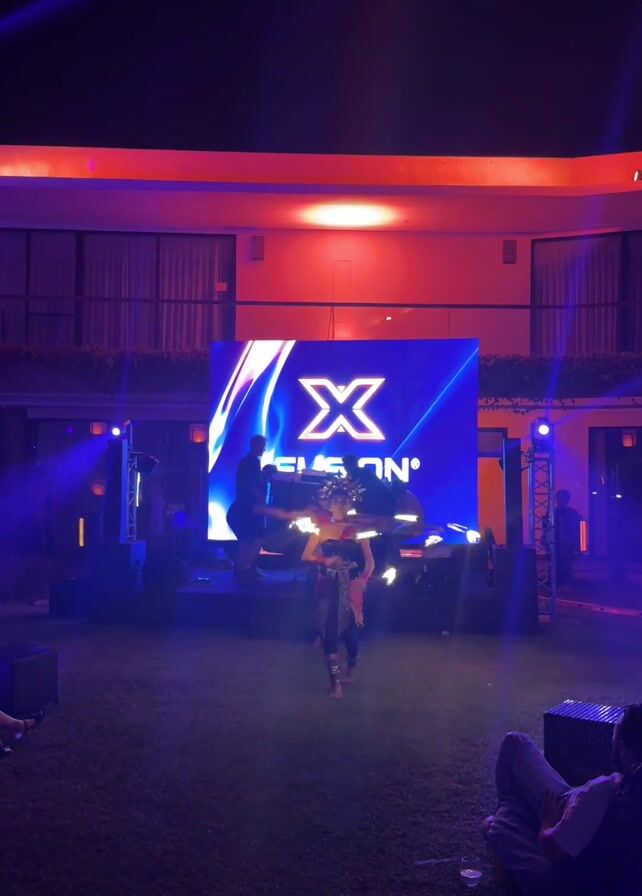 A short, wide shot captures two dancers in traditional Indonesian garb performing in front of a large, bright LED screen that reads "X FUSION" during an outdoor event at night