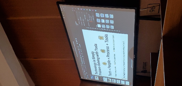 The image depicts an indoor presentation setting, likely a lecture hall or conference room, focused on a large, illuminated screen displaying a technical presentation slide